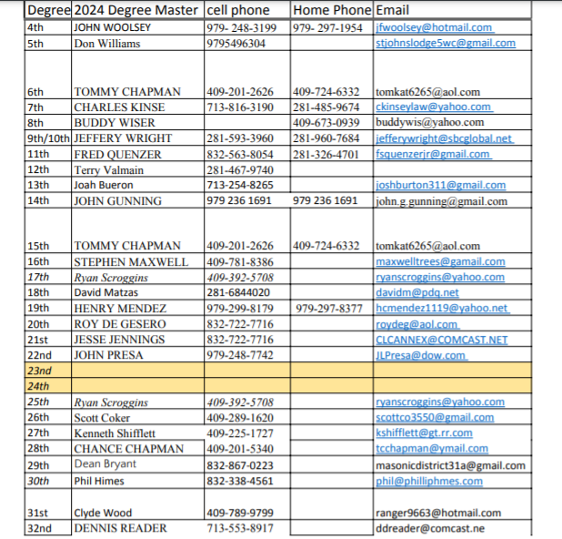 If you are interested in helping with a particular degree please contact the Degree Master or Reunion Directors. If you are interested in working on stage, behind the scenes, or in any other capacity in the theater please contact the stage directors or managers. The following degree masters list is current as of September 25, 2017, if you see any errors or changes needed please This email address is being protected from spambots. You need JavaScript enabled to view it..